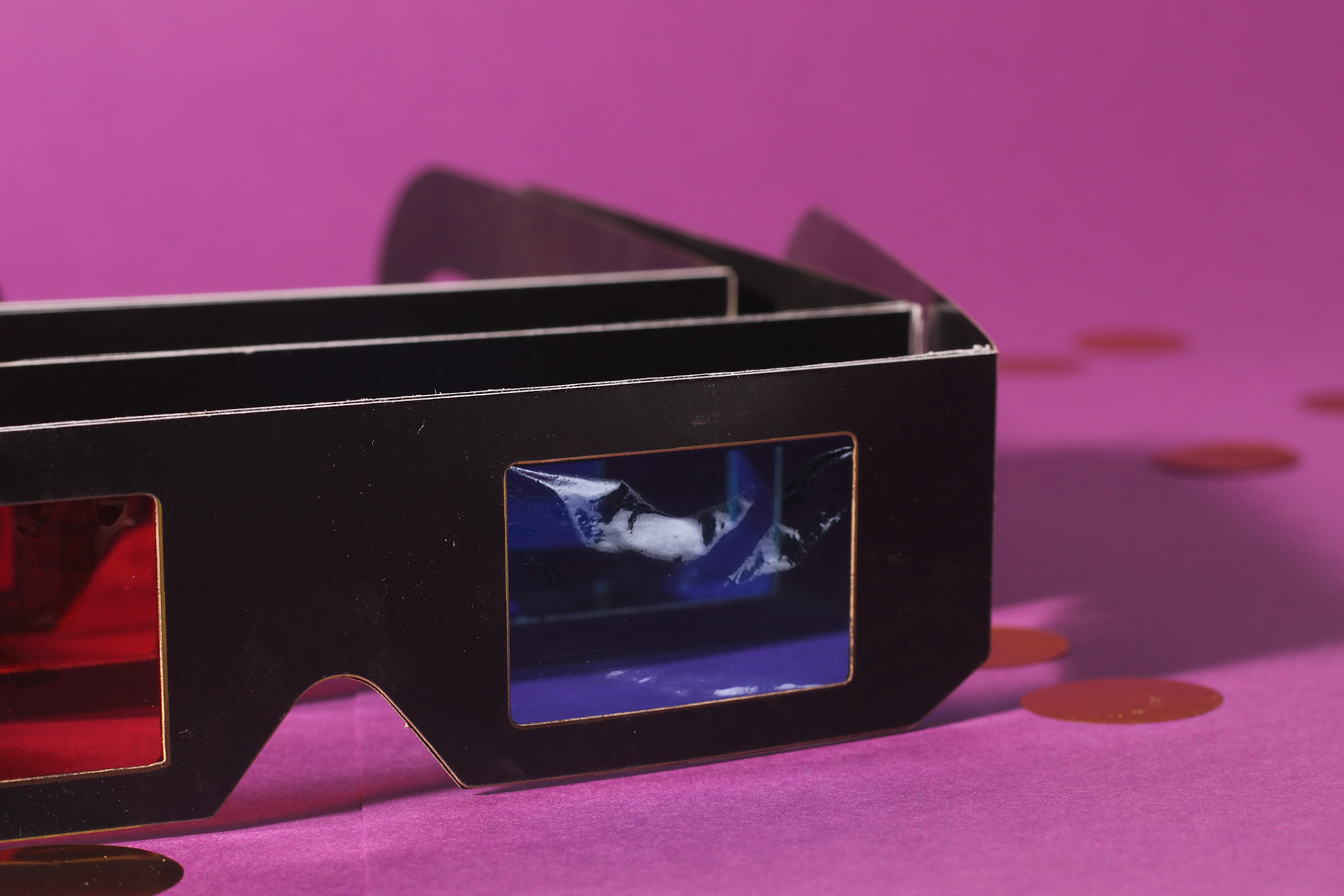 Studio photography of 3D glasses, designed and created by myself. Shot as part of a wider project for an FMP of a corporate identity design of a cinema